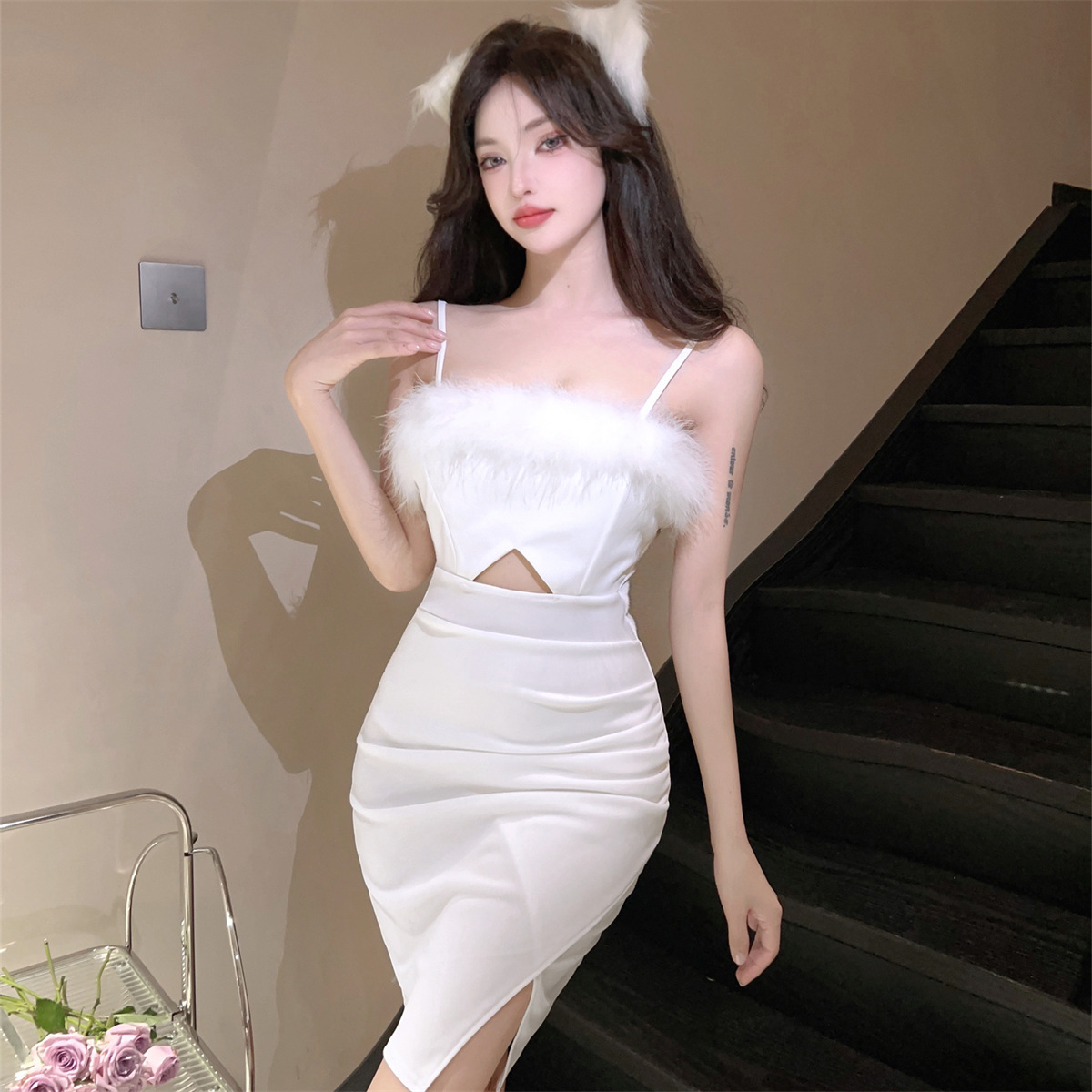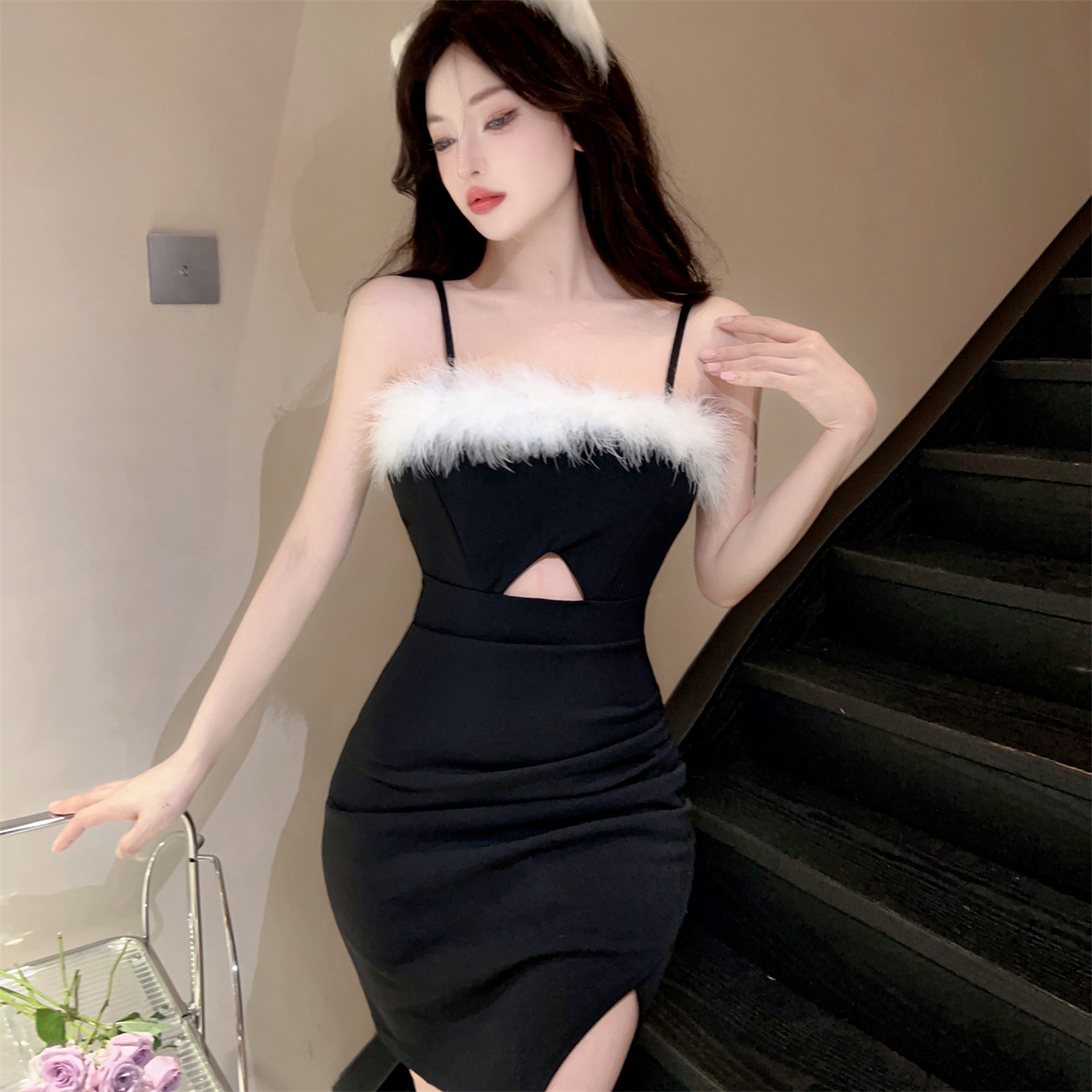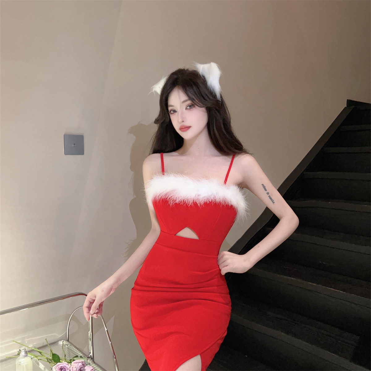 JR01QJ Sexy Sling Strap Mao Mao Hollow Foled Bag Hip Vented Christmas Dress