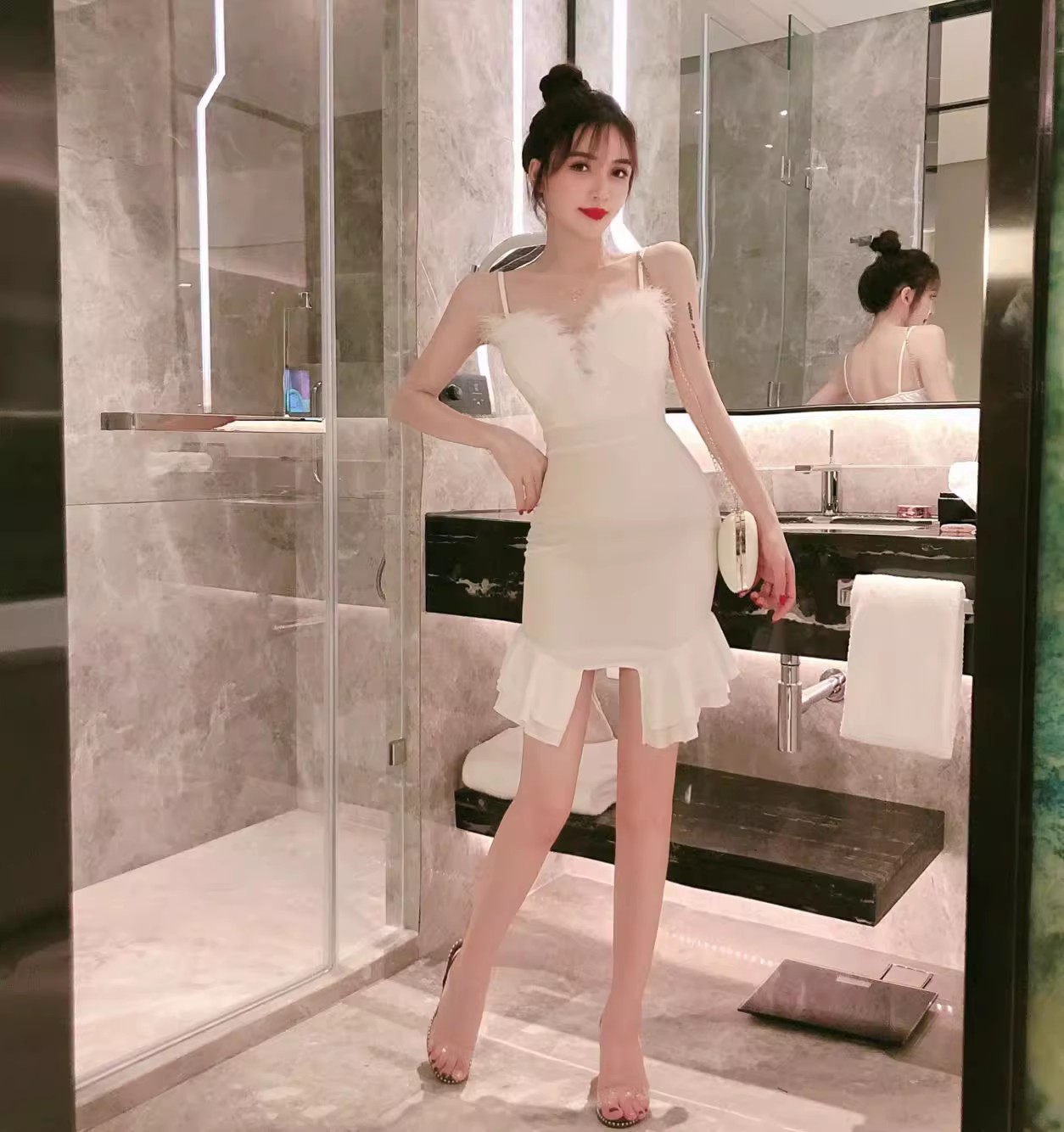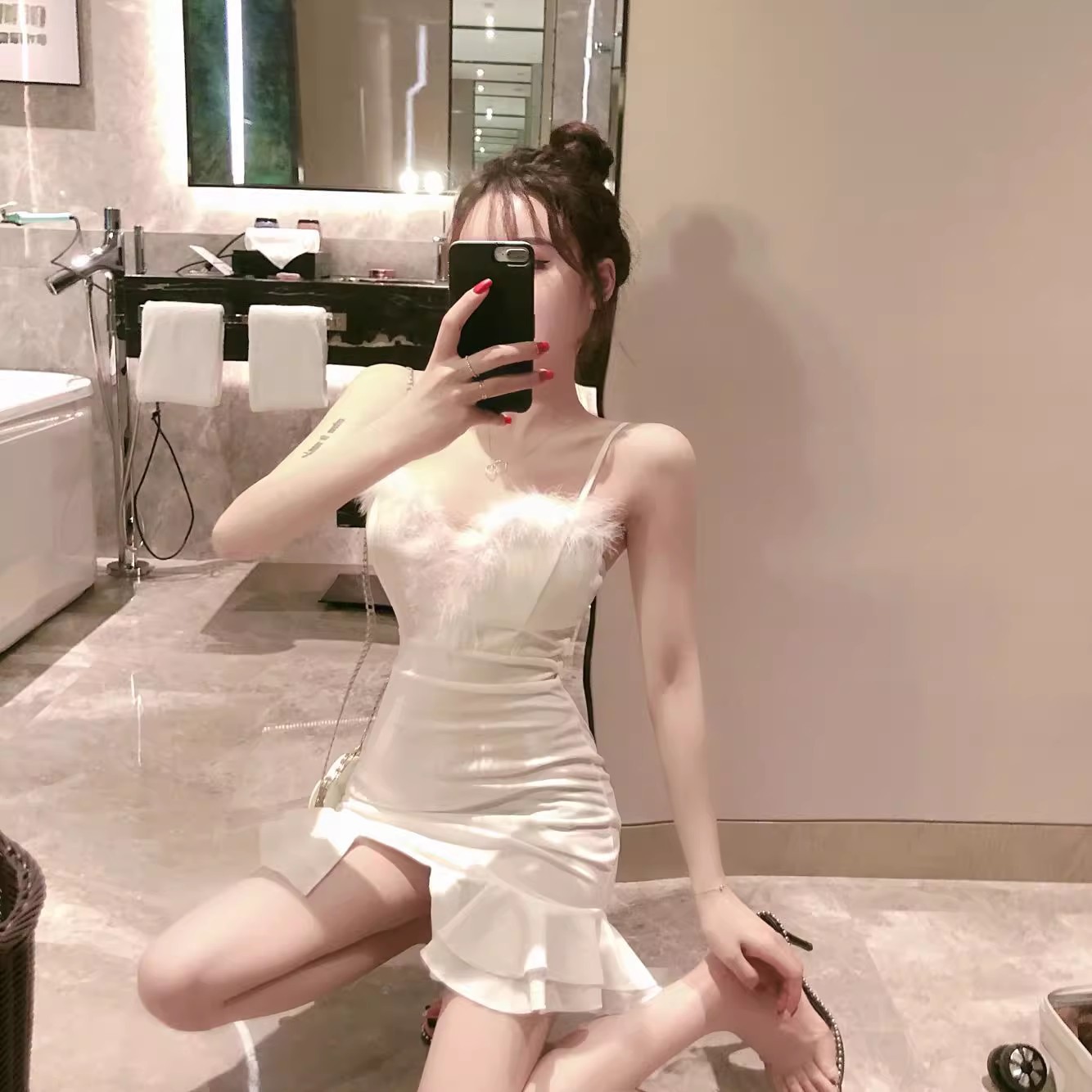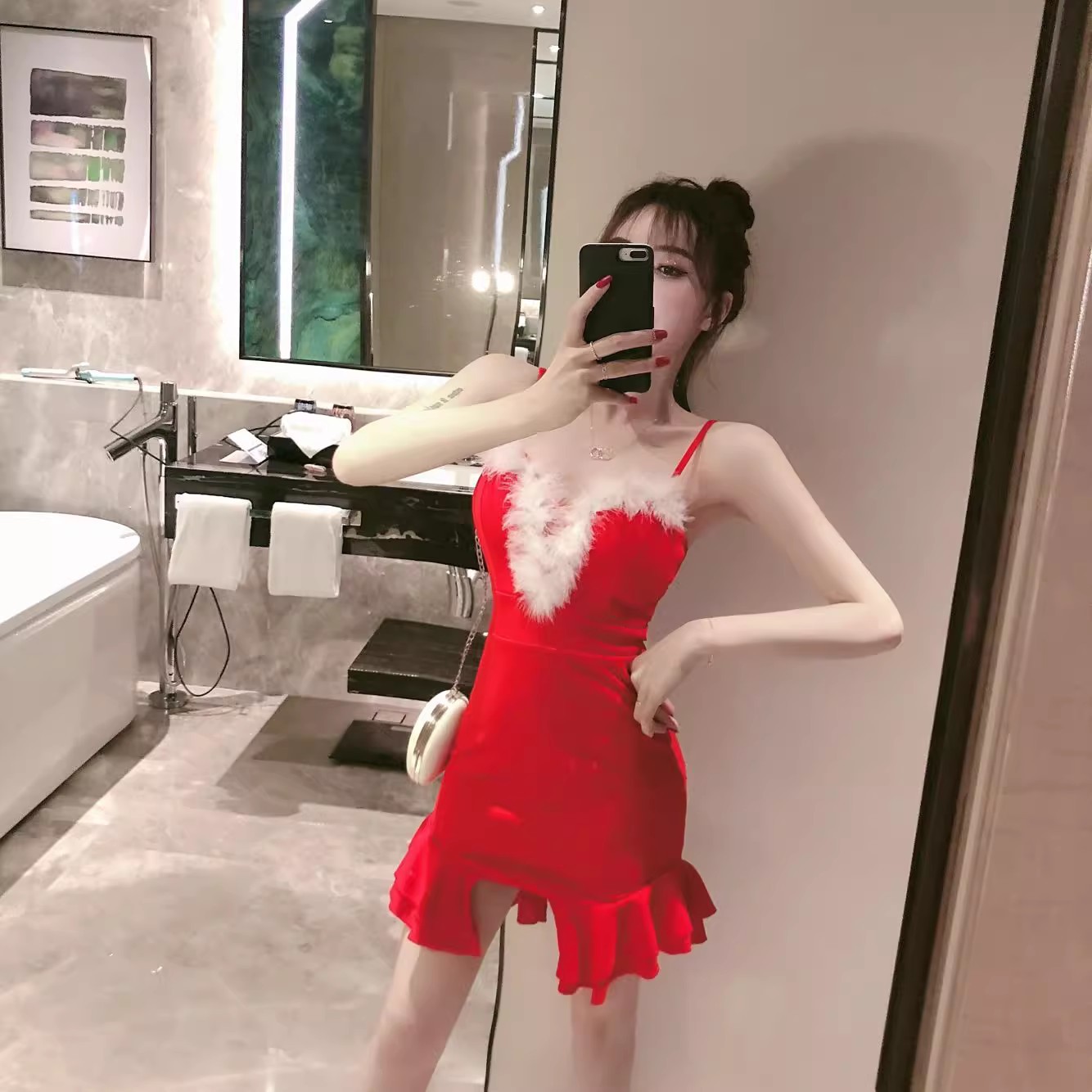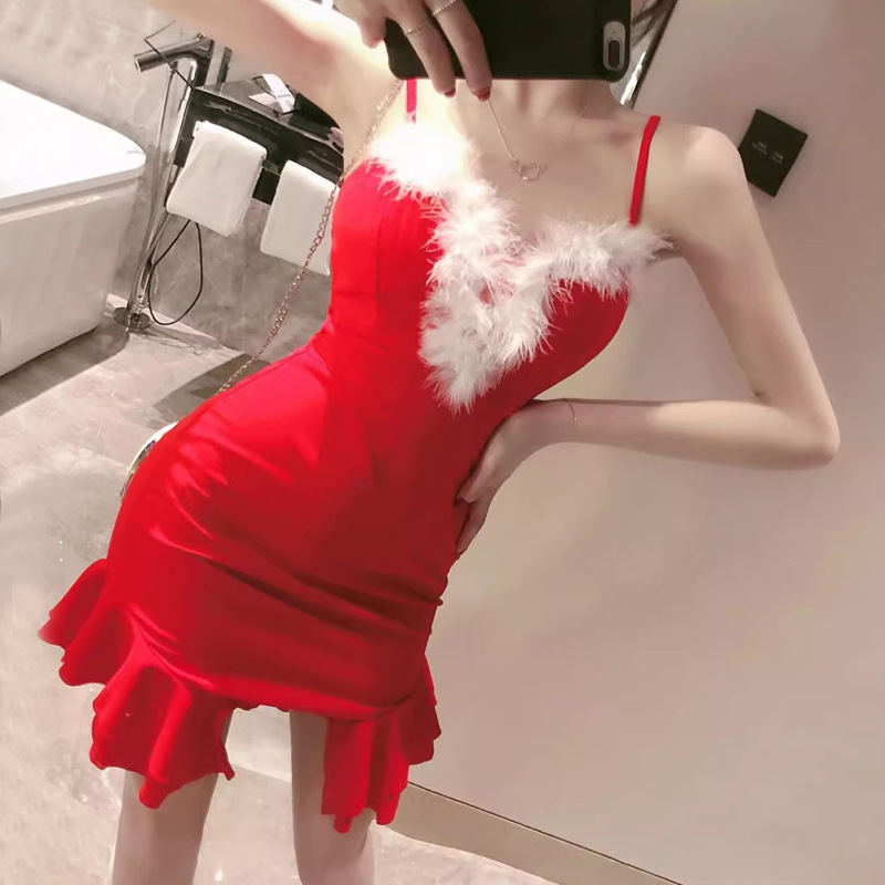 JR01QJ Women's Sexy Low-cut Waisted Ruffled Hip-wrap Christmas Dress