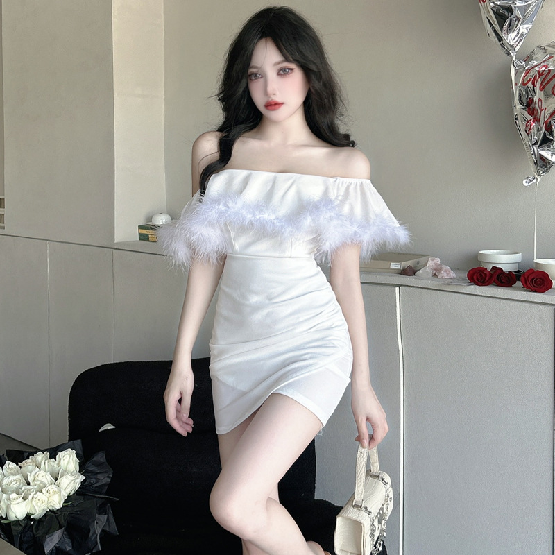 JR01QJ Women's Sexy One-word Collar Open-shoulder Waist Hip Christmas Dress