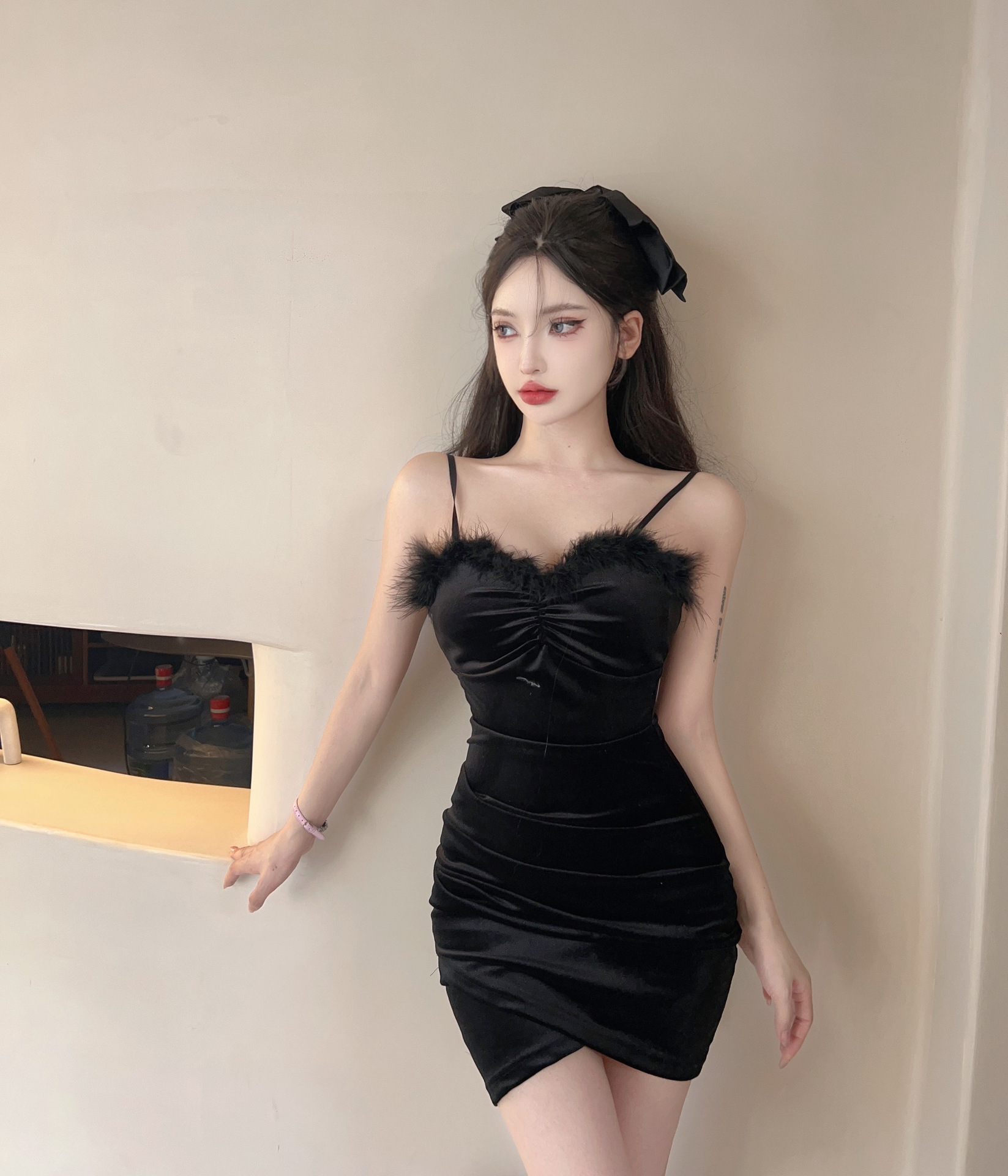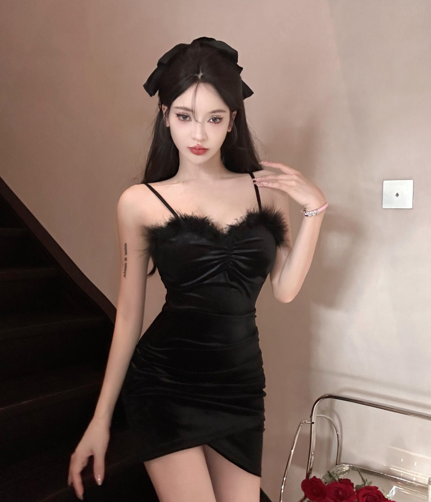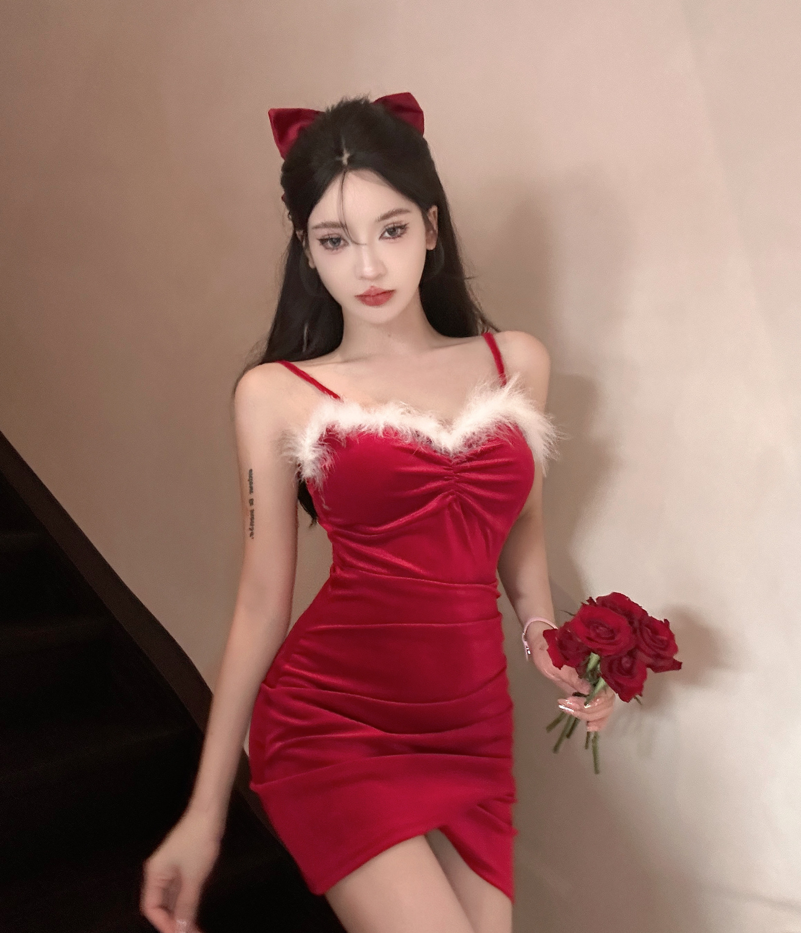 Increase quantity for JR01QJ Women's Sexy Suspender Mao Mao Stitching Velvet Hip Christmas Dress