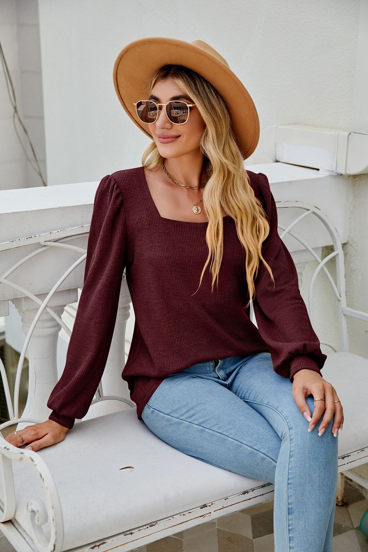 AB09HL Cross-border European And American Women's Clothing Amazon Independent Station New U-collar Pleated Bubble Sleeve Top Loose Casual Solid Color T-shirt