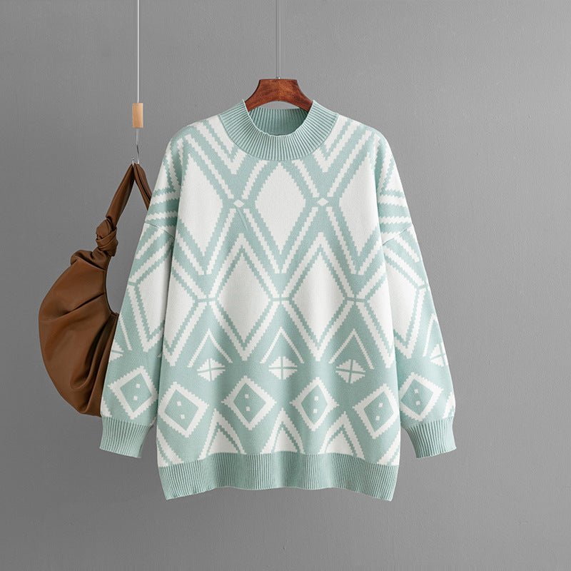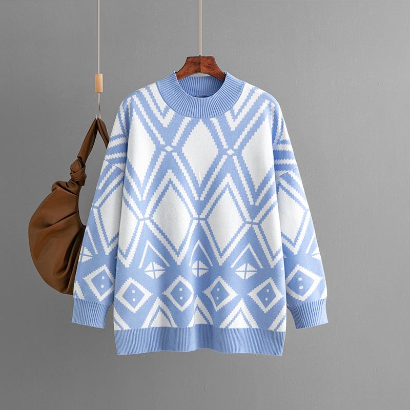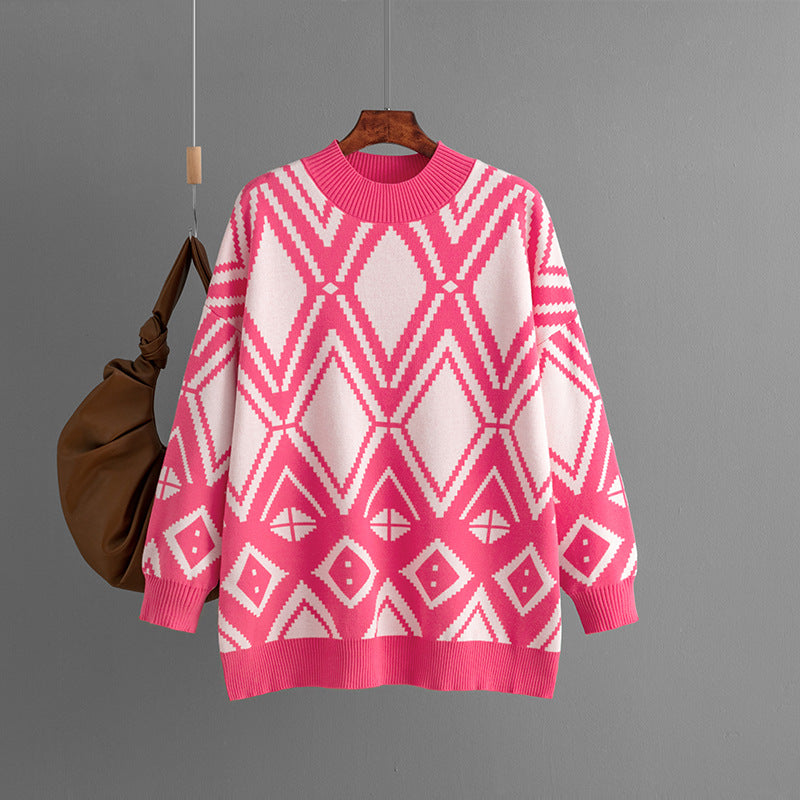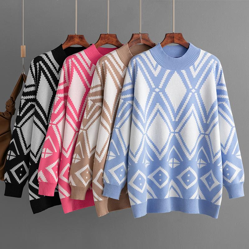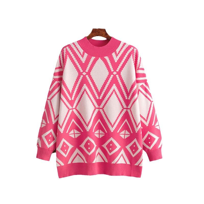 AB06QX Cross-border Women's 2023 Autumn And Winter New Geometric Jacquard Crewneck Sweater Loose Mid-length Knitted Top For Women
