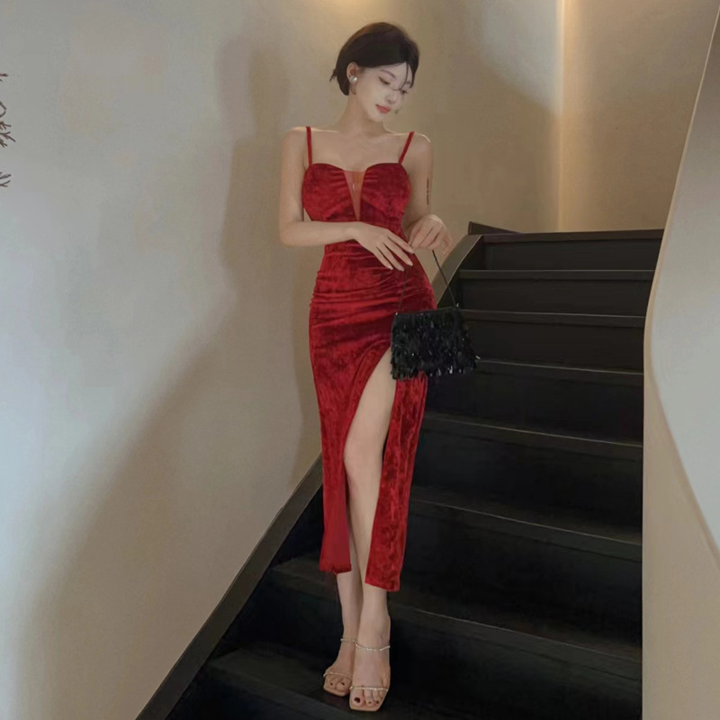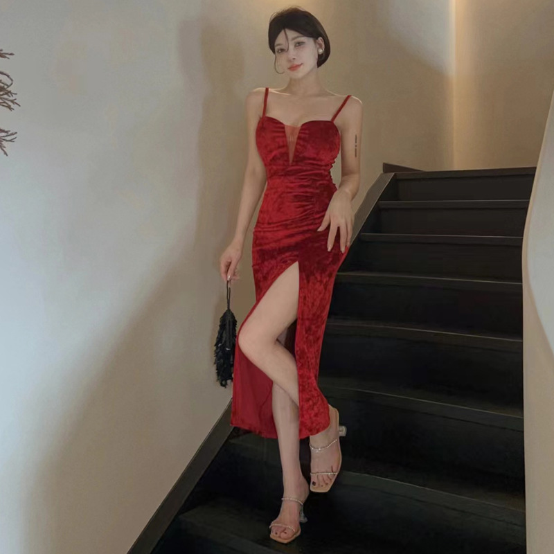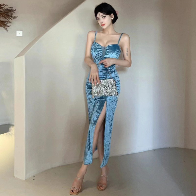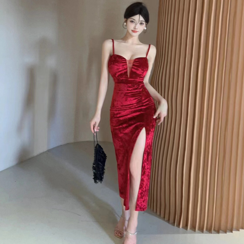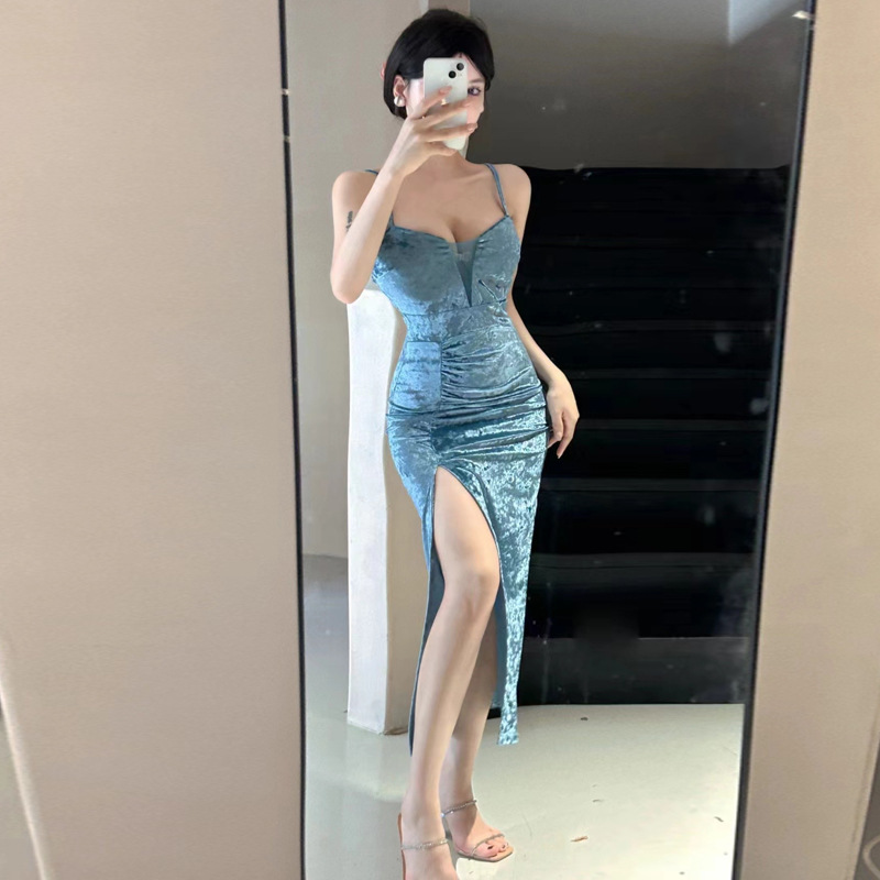 JR01QJ Women's Sexy Sling Sling Perspective Gold Velvet High Vented Hip Bag Dress