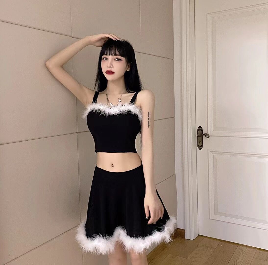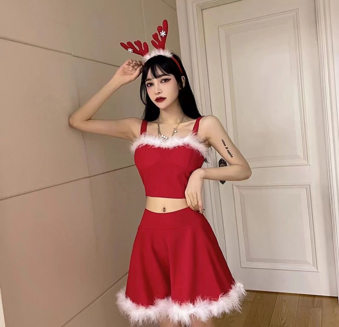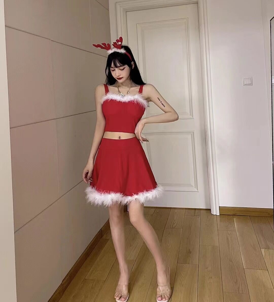 JR01QJ Women's Sexy Strap Top Mao Mao Skirt Christmas Set