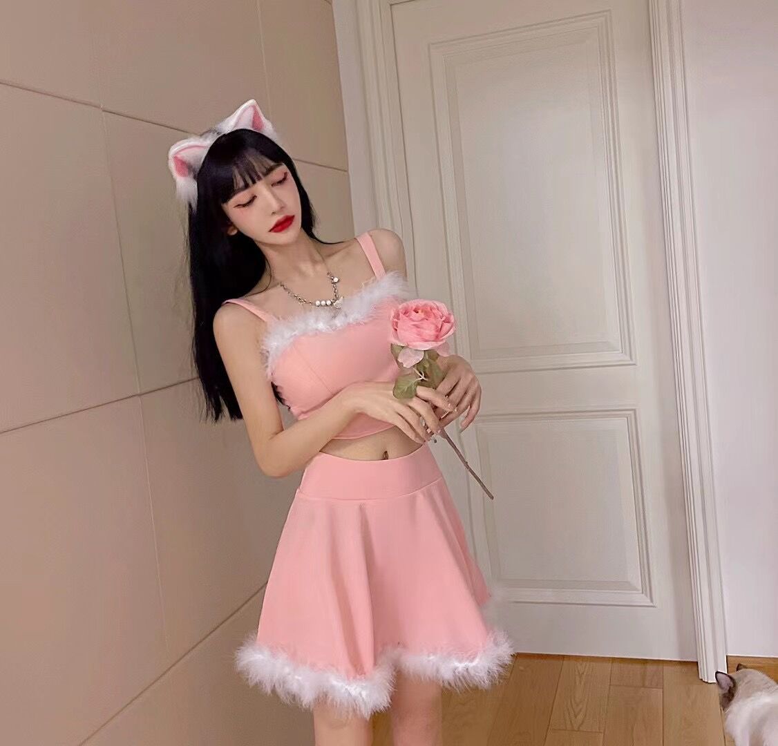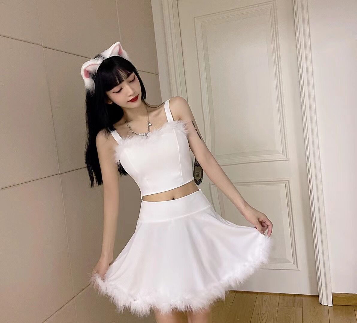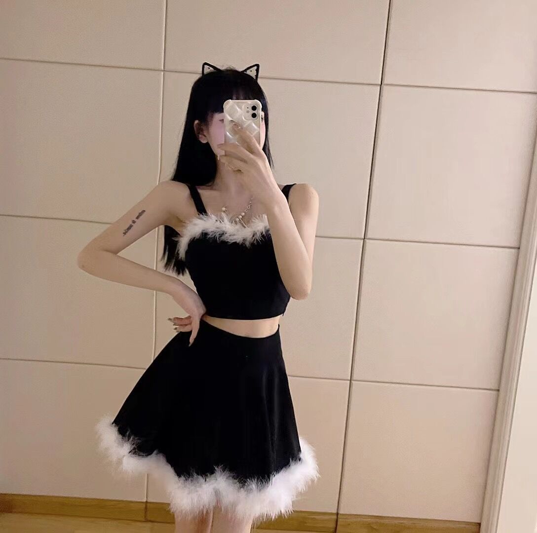 JR01QJ Women's Sexy Strap Top Mao Mao Skirt Christmas Set